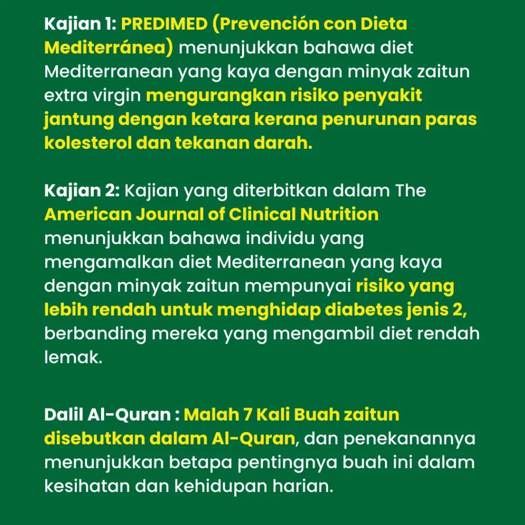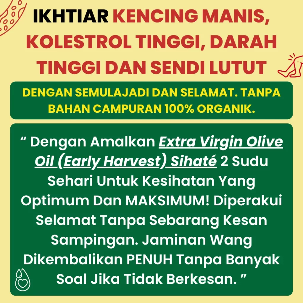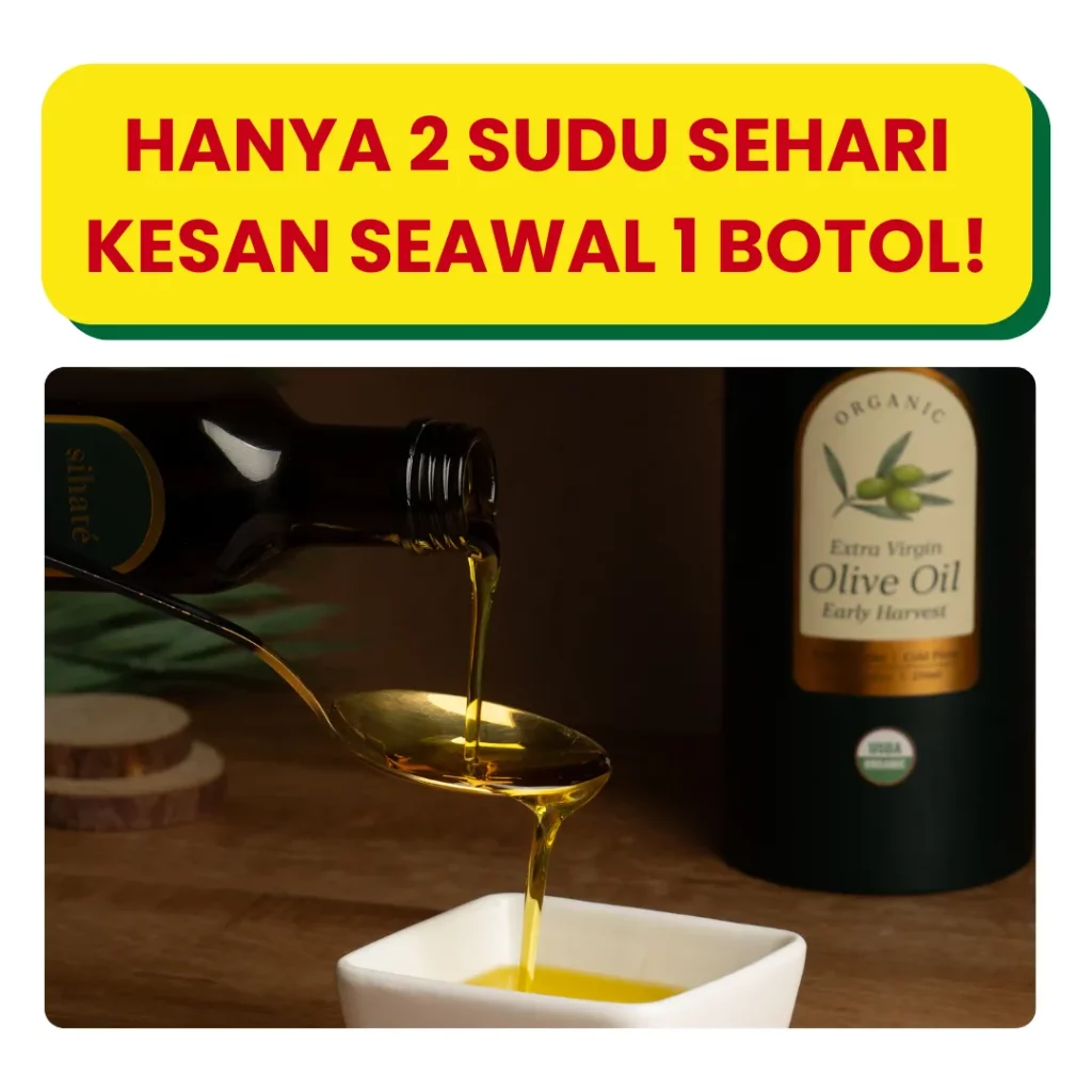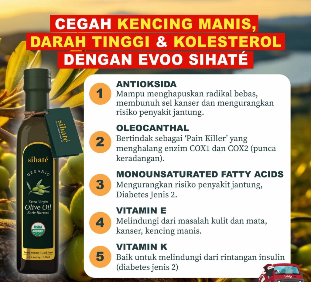 EVOO Sihaté kaya dengan polifenol, antioksidan, dan lemak tak tepu yang membantu meningkatkan sensitiviti insulin, mengurangkan tekanan darah, dan menurunkan kolesterol jahat (LDL).