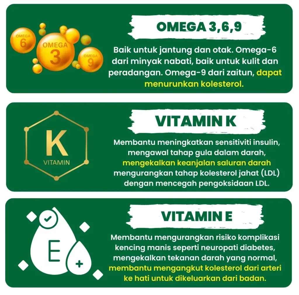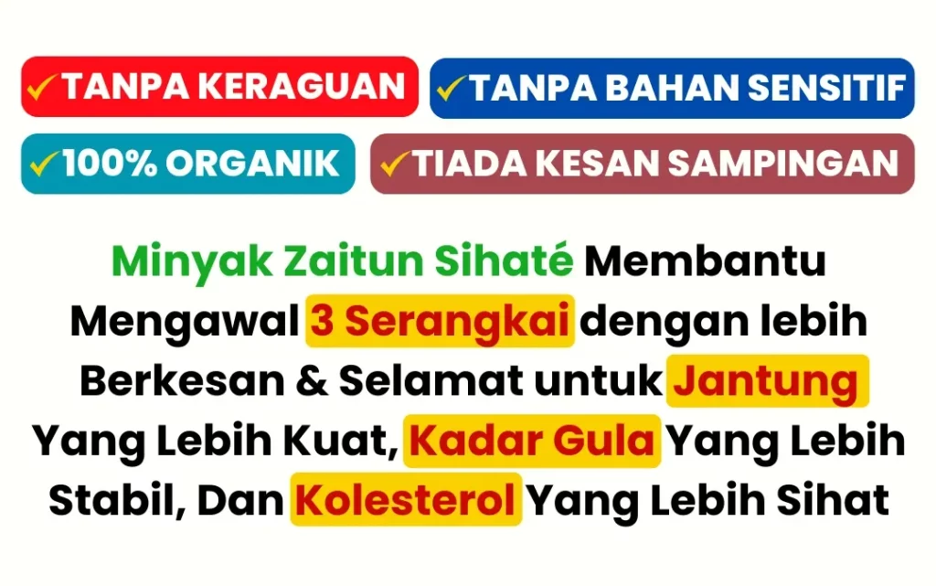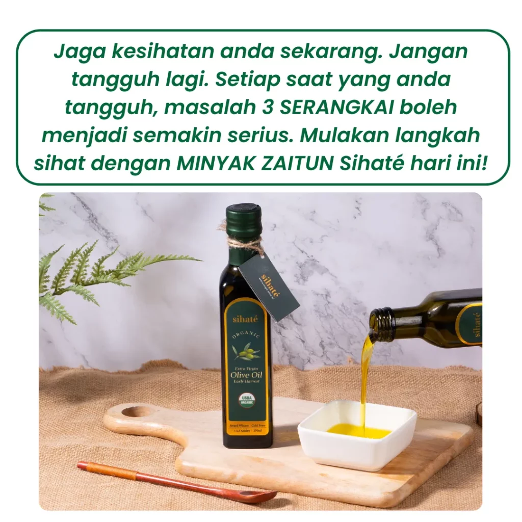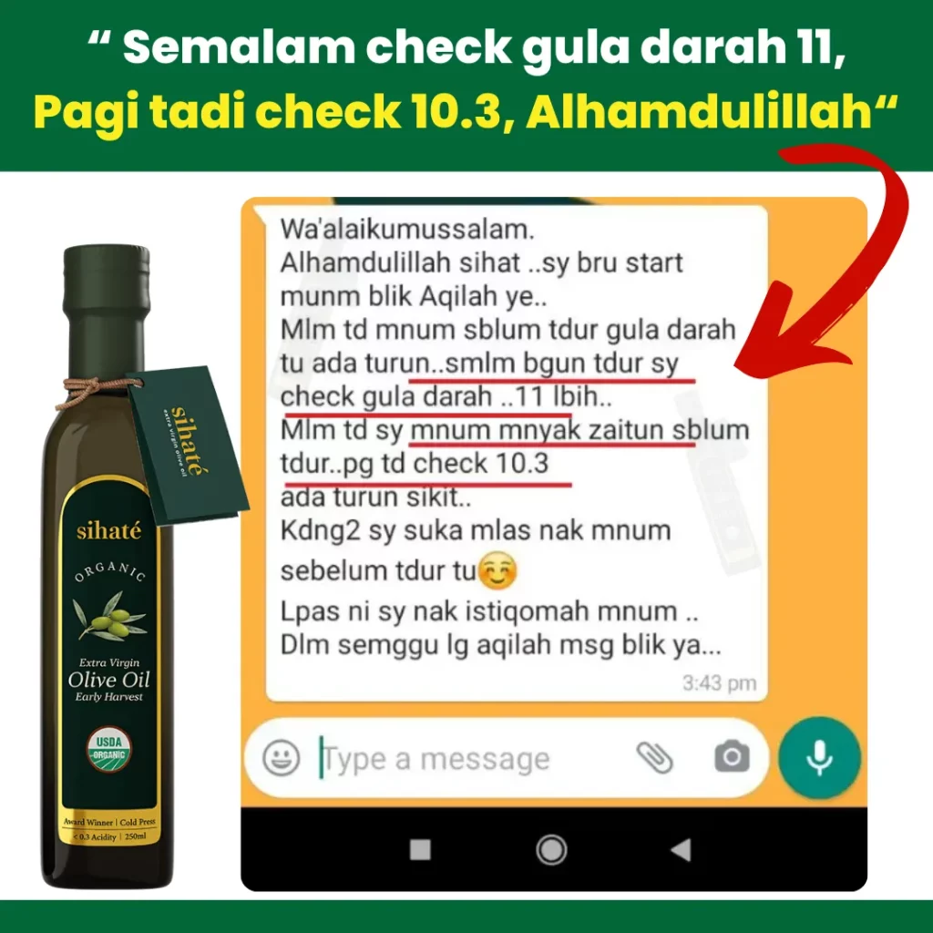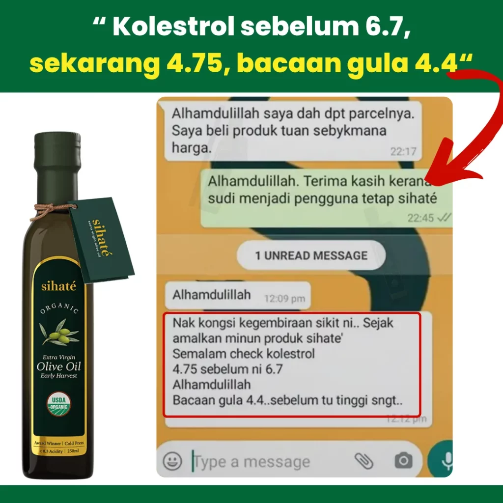EVOO Sihaté kaya dengan polifenol, antioksidan, dan lemak tak tepu yang membantu meningkatkan sensitiviti insulin, mengurangkan tekanan darah, dan menurunkan kolesterol jahat (LDL).