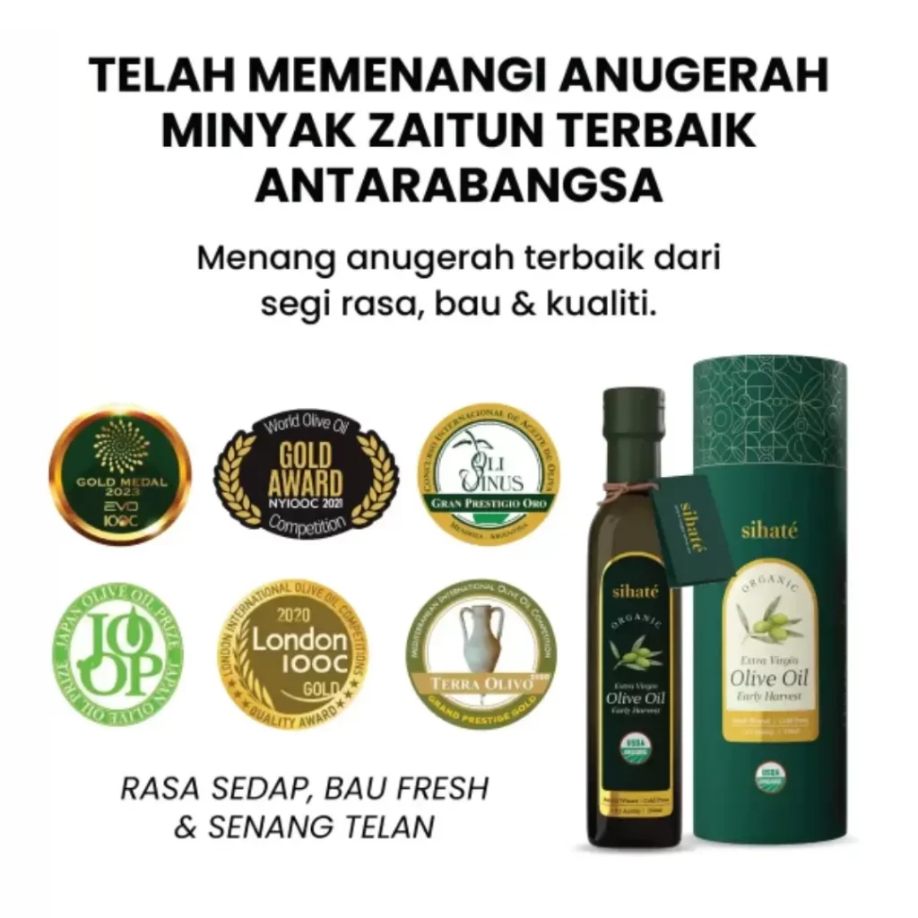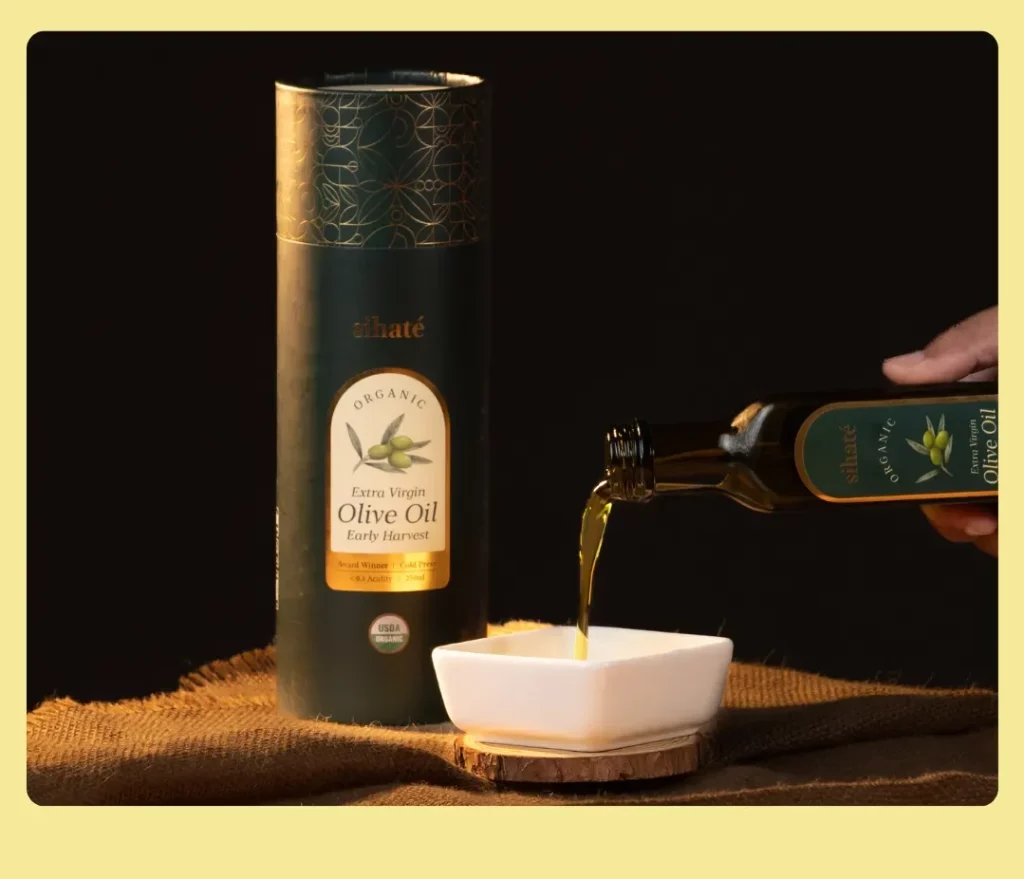 EVOO Sihaté berasal dari zaitun tuaian awal, menggunakan teknik perahan sejuk, dan diiktiraf organik oleh USDA. Minyak ini juga telah memenangi pelbagai anugerah antarabangsa dan diuji dua kali di makmal untuk memastikan keaslian dan kualiti.