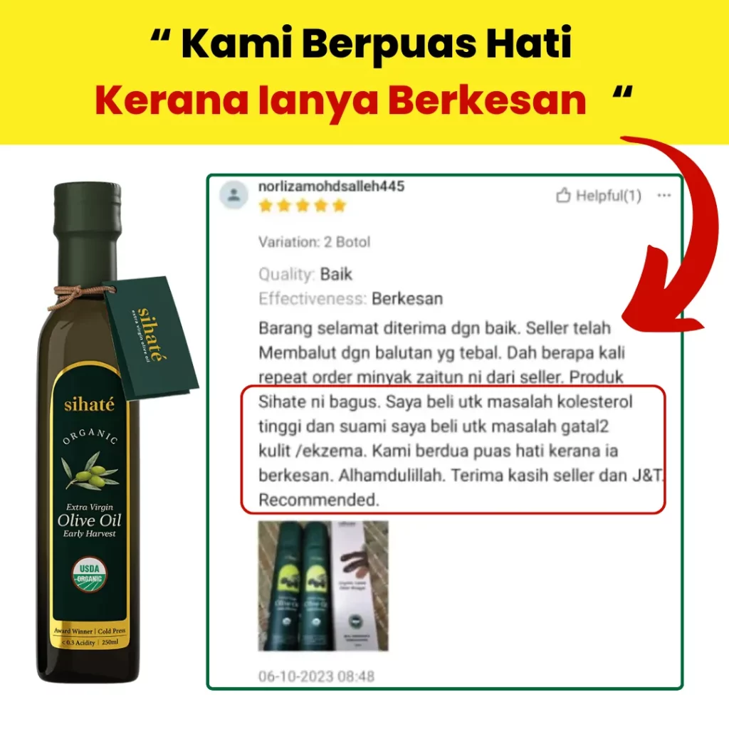 Kami menawarkan jaminan wang dikembalikan sepenuhnya jika anda tidak berpuas hati dengan kualiti EVOO Sihaté, tanpa banyak soal.