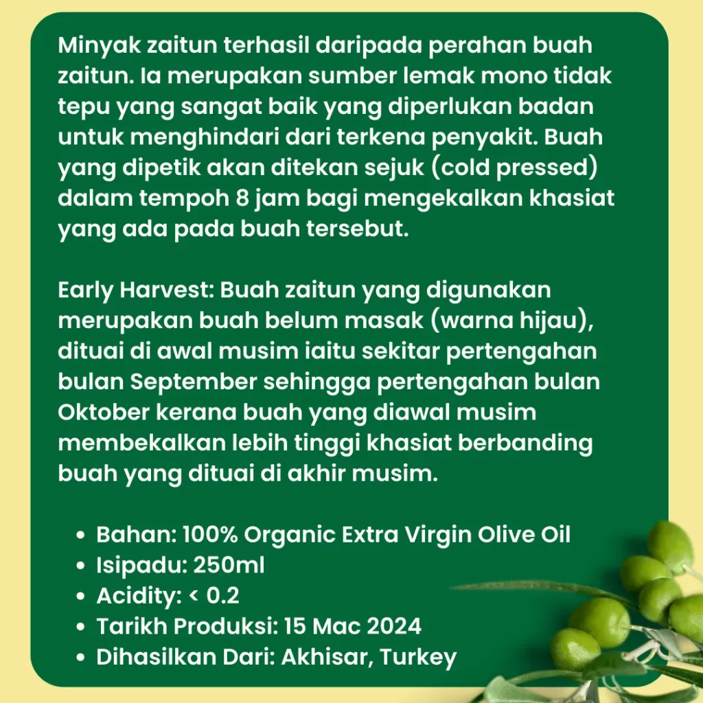 EVOO Sihaté adalah Extra Virgin Olive Oil berkualiti premium yang dihasilkan daripada buah zaitun yang dituai awal di Turki, di mana proses perahan sejuk digunakan untuk memastikan kualiti minyak terbaik.